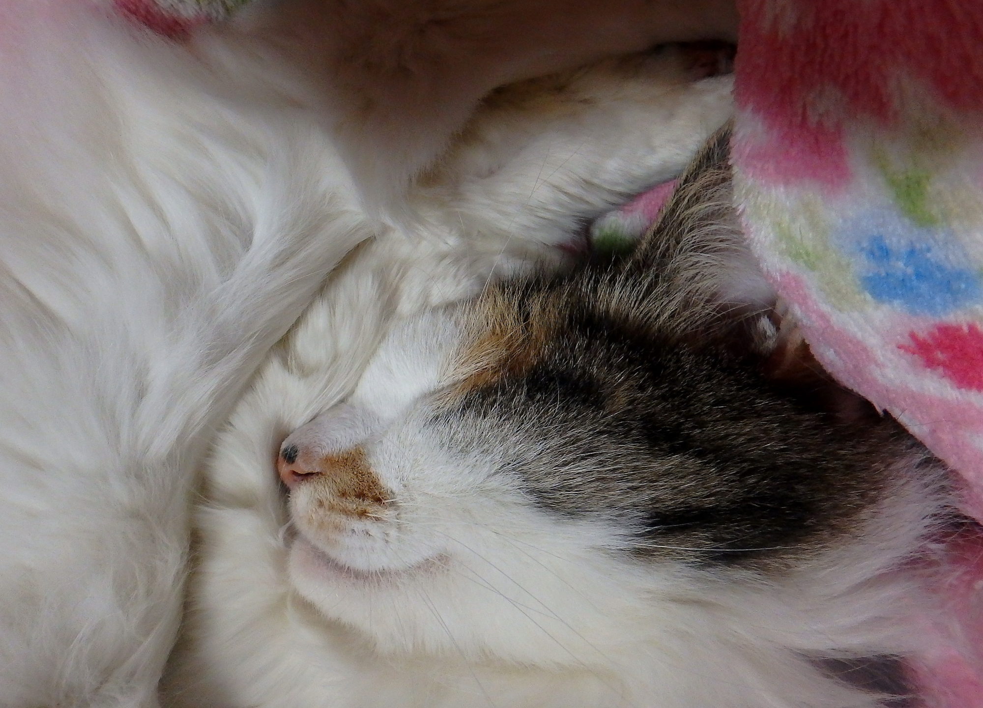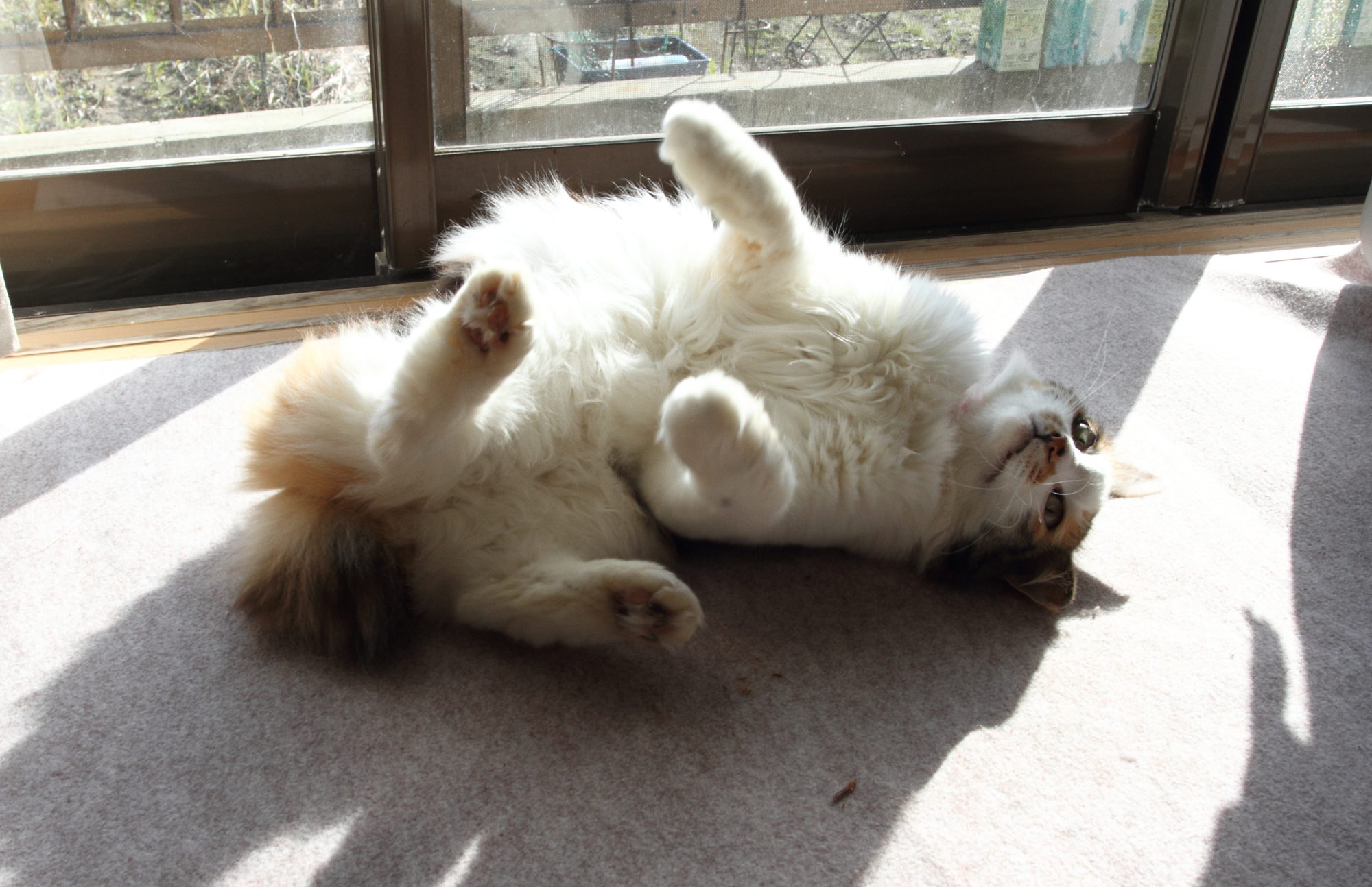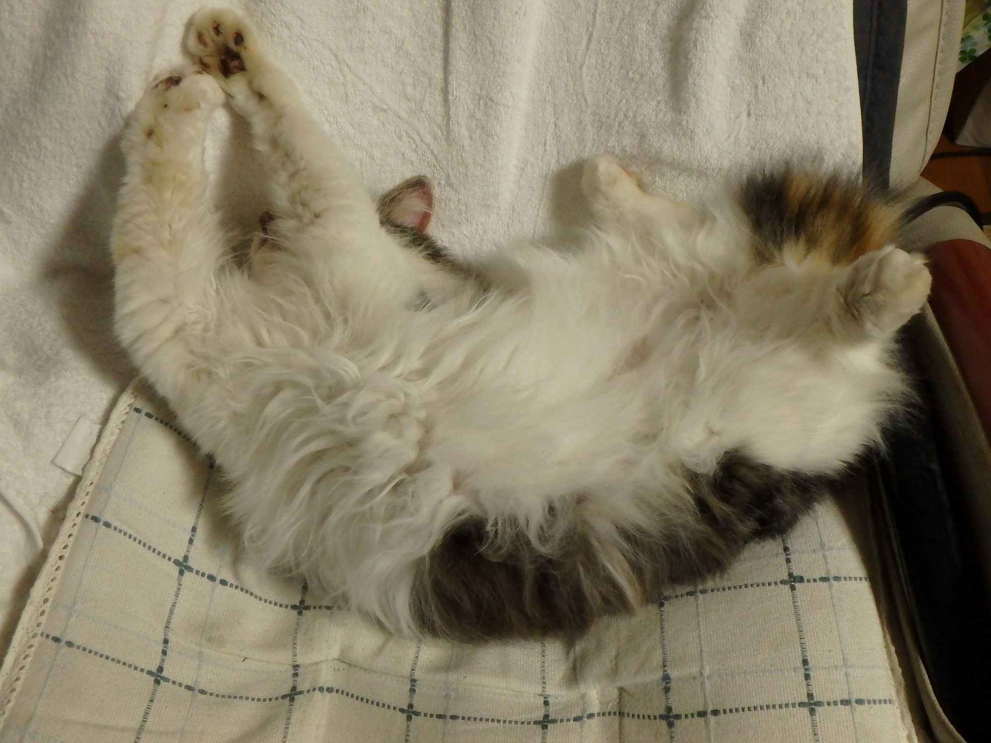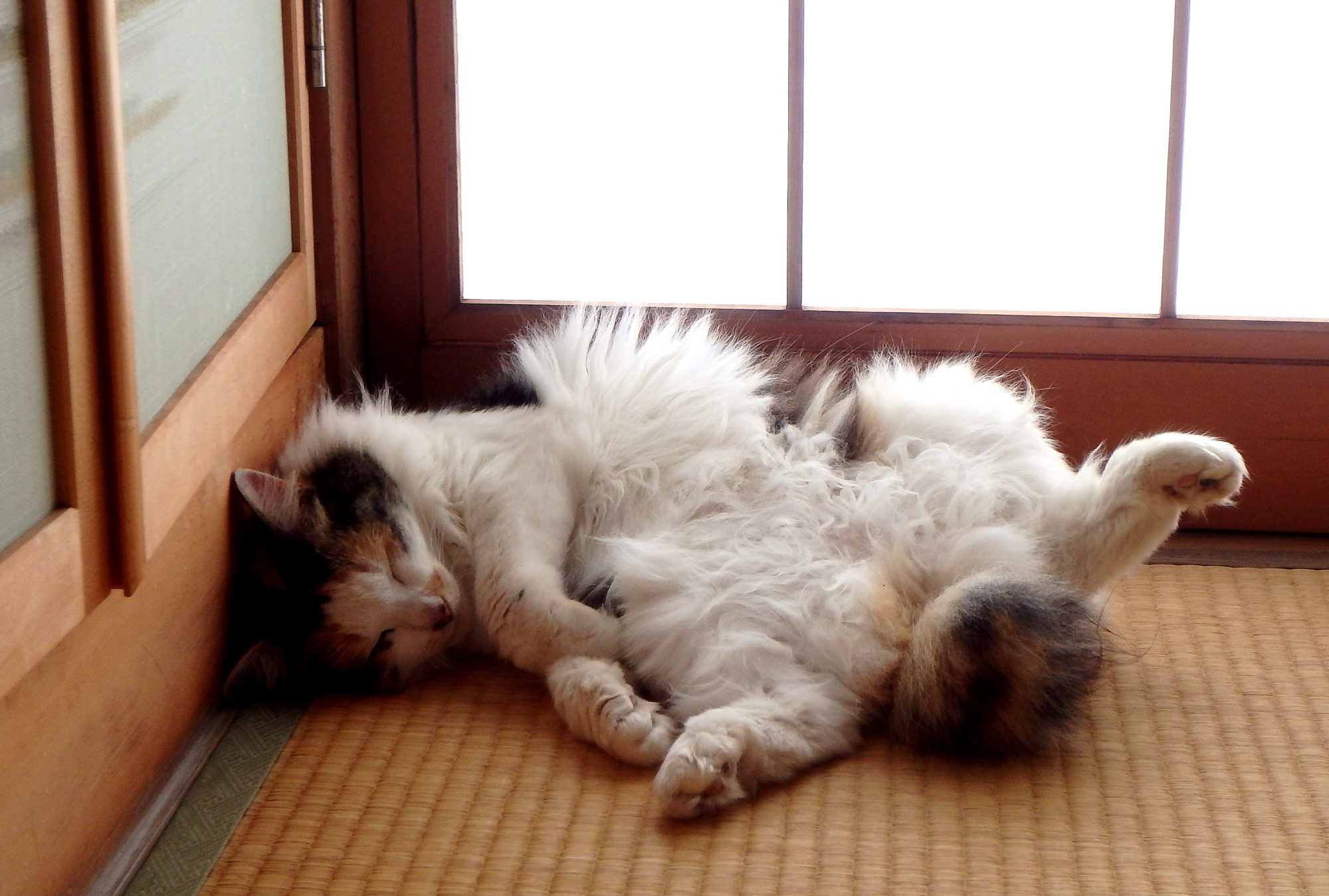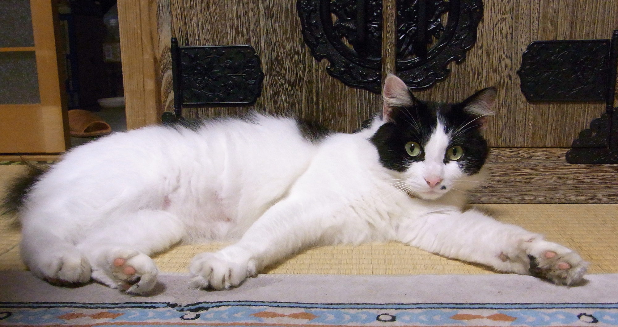 上の猫と別猫のようで、シロは毛深くなってます。実際体重も夏と冬では1キロ以上差がありました。が、自然と夏になると細くなるので、「シロ、どうやってダイエットしたのか?」と太り気味の人間が二人ほど聞いてました。太ると毛繕いも大変そうで、襖や柱に寄りかかって毛繕いしてました。重い時は、6キロ近くありました。
