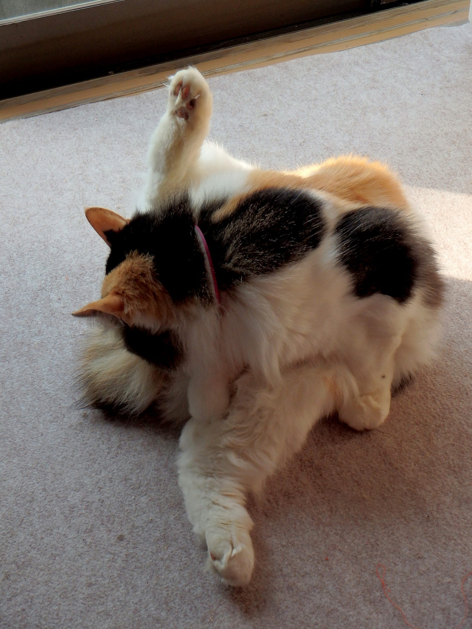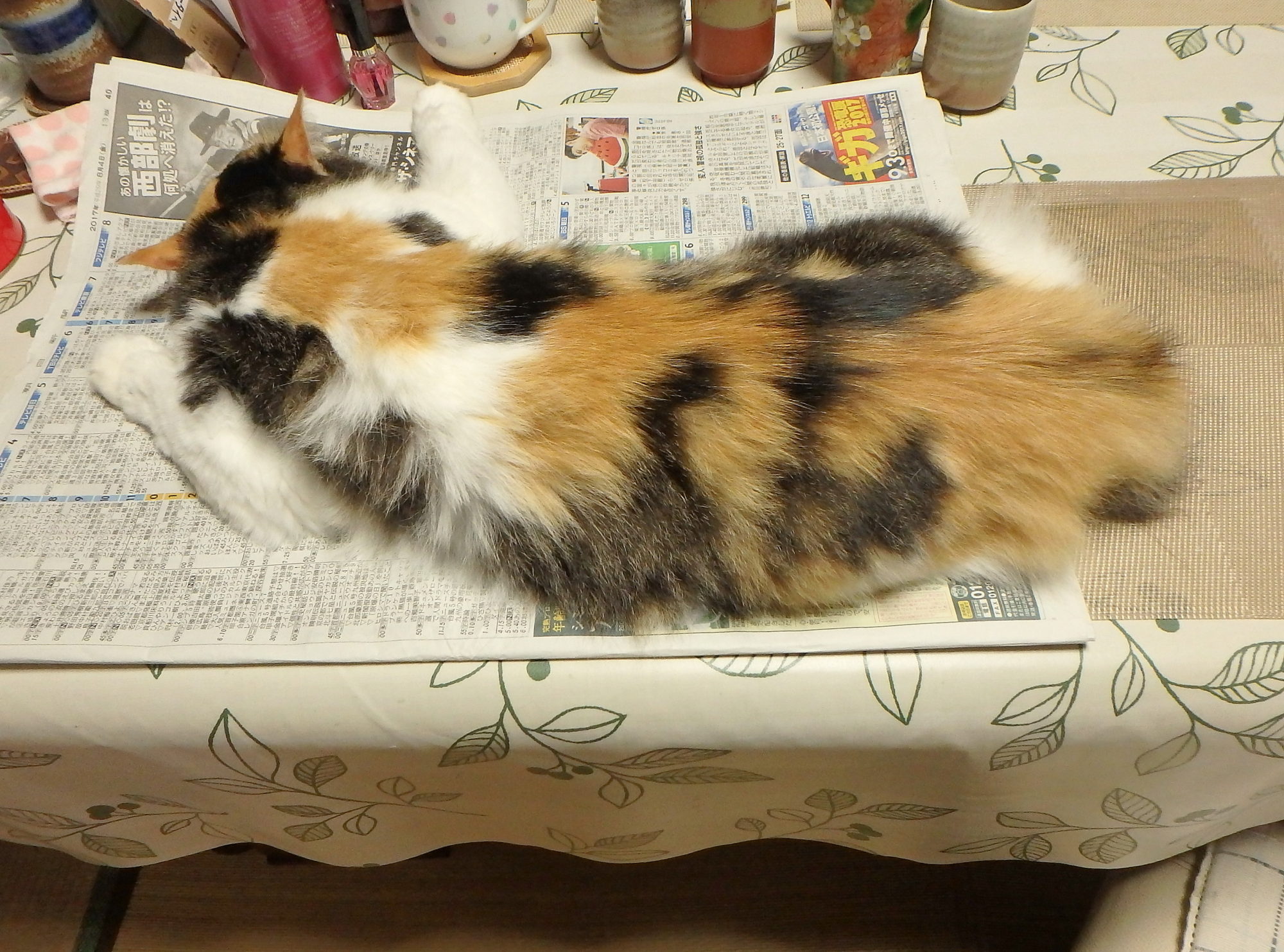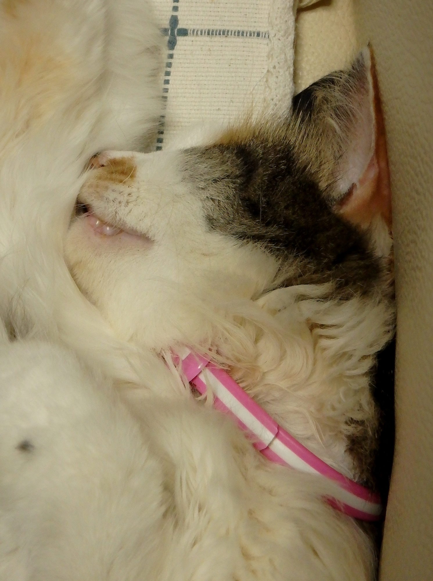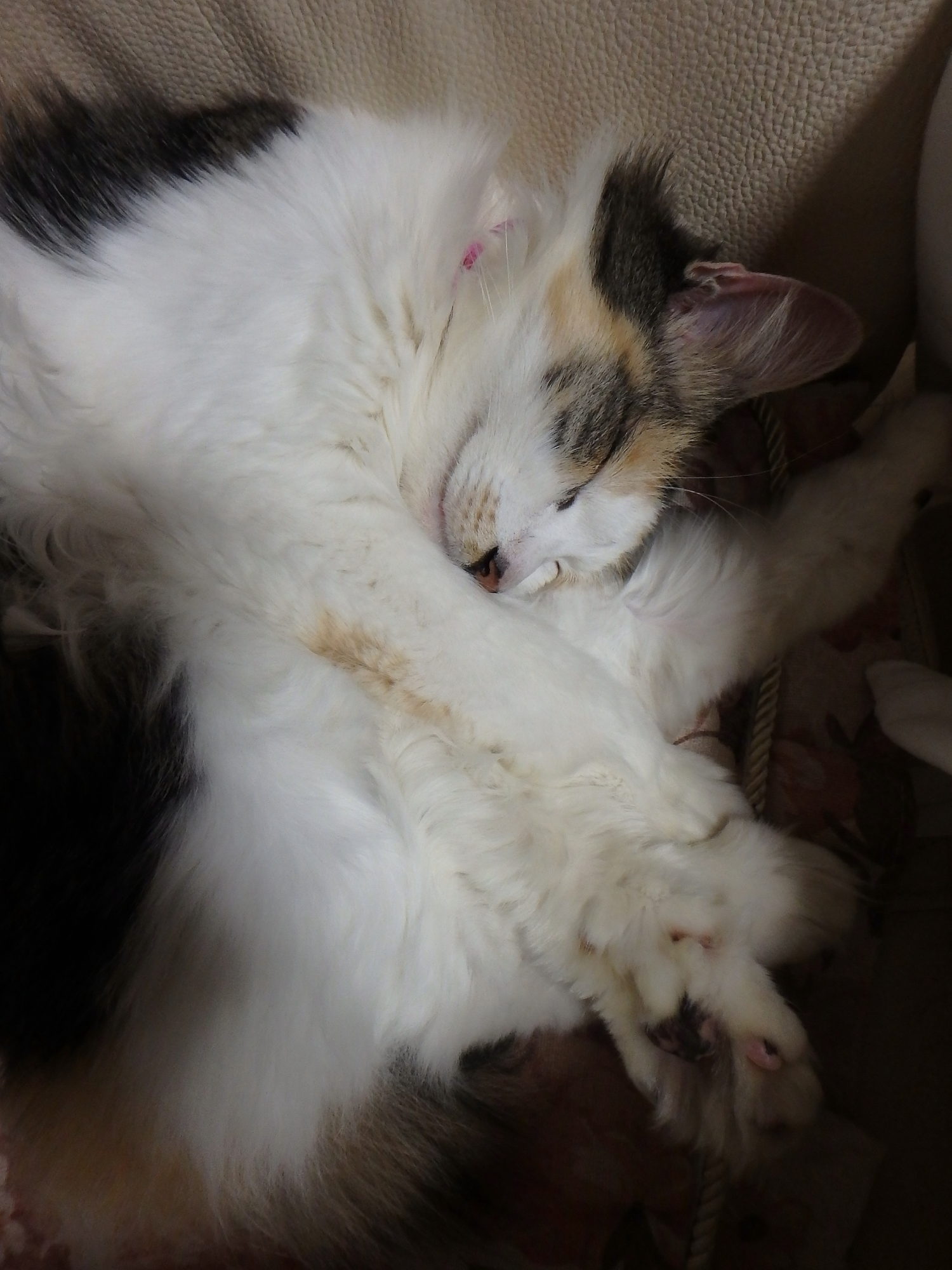 上の猫と別猫のようで、シロは毛深くなってます。実際体重も夏と冬では1キロ以上差がありました。が、自然と夏になると細くなるので、「シロ、どうやってダイエットしたのか?」と太り気味の人間が二人ほど聞いてました。太ると毛繕いも大変そうで、襖や柱に寄りかかって毛繕いしてました。重い時は、6キロ近くありました。