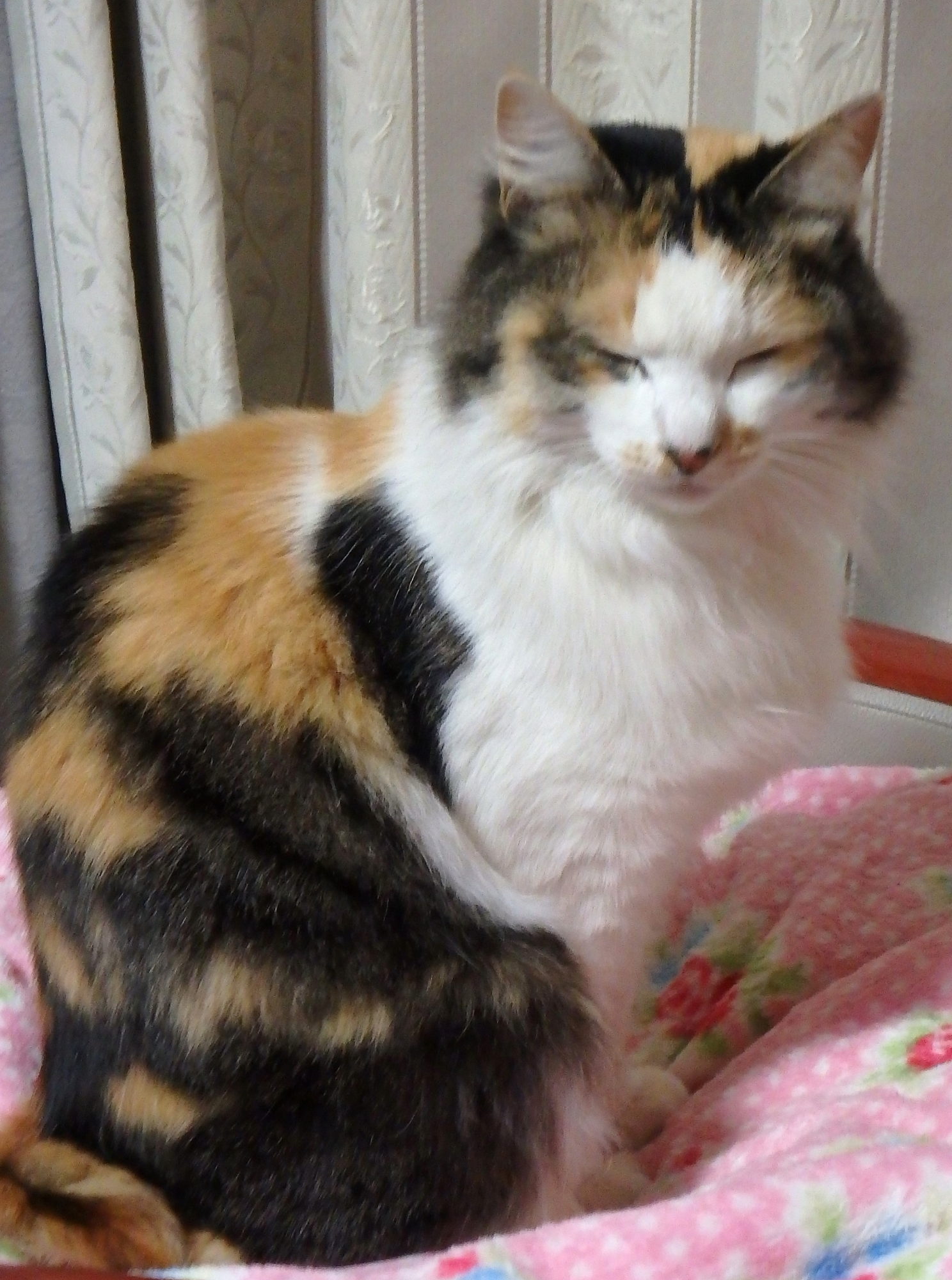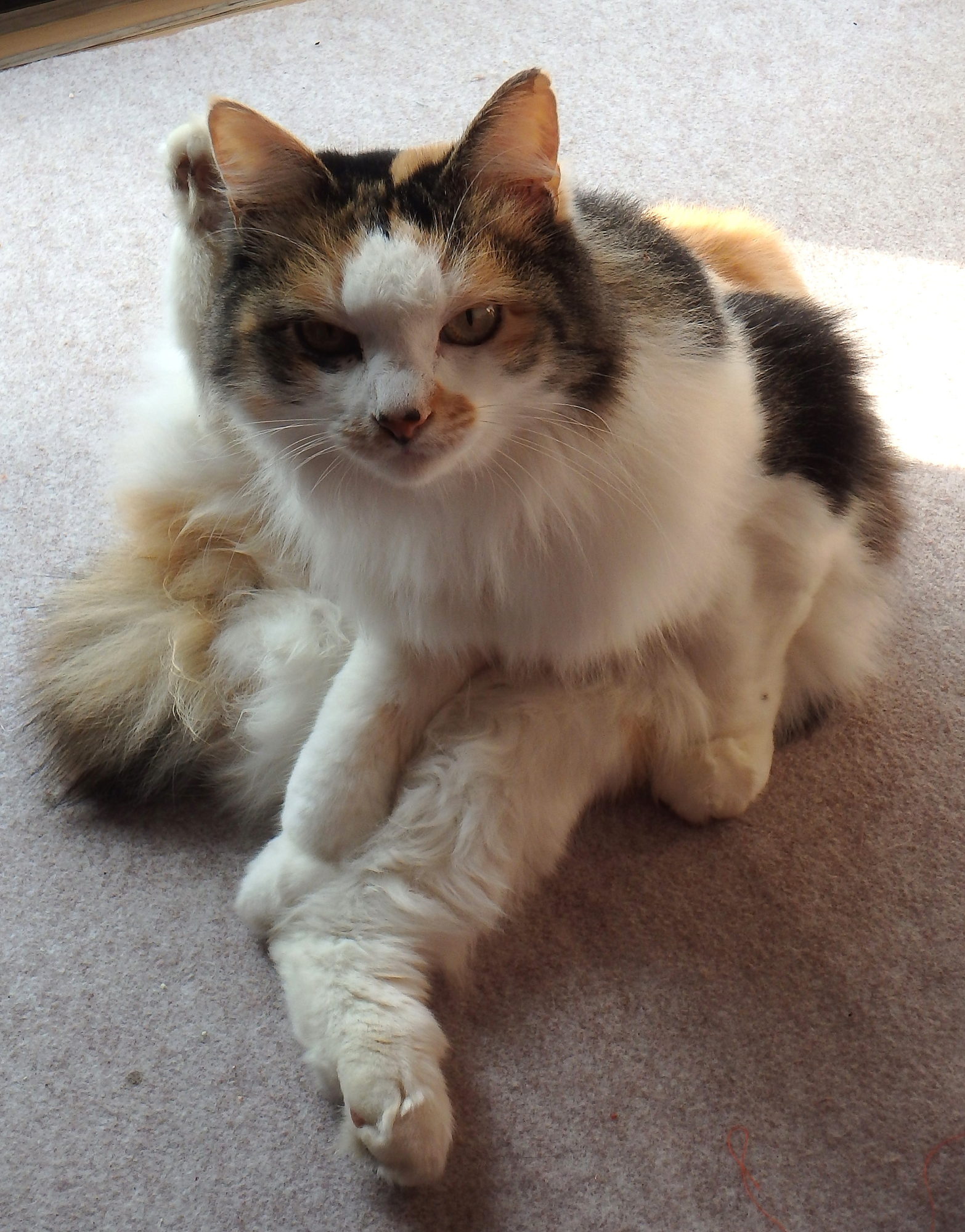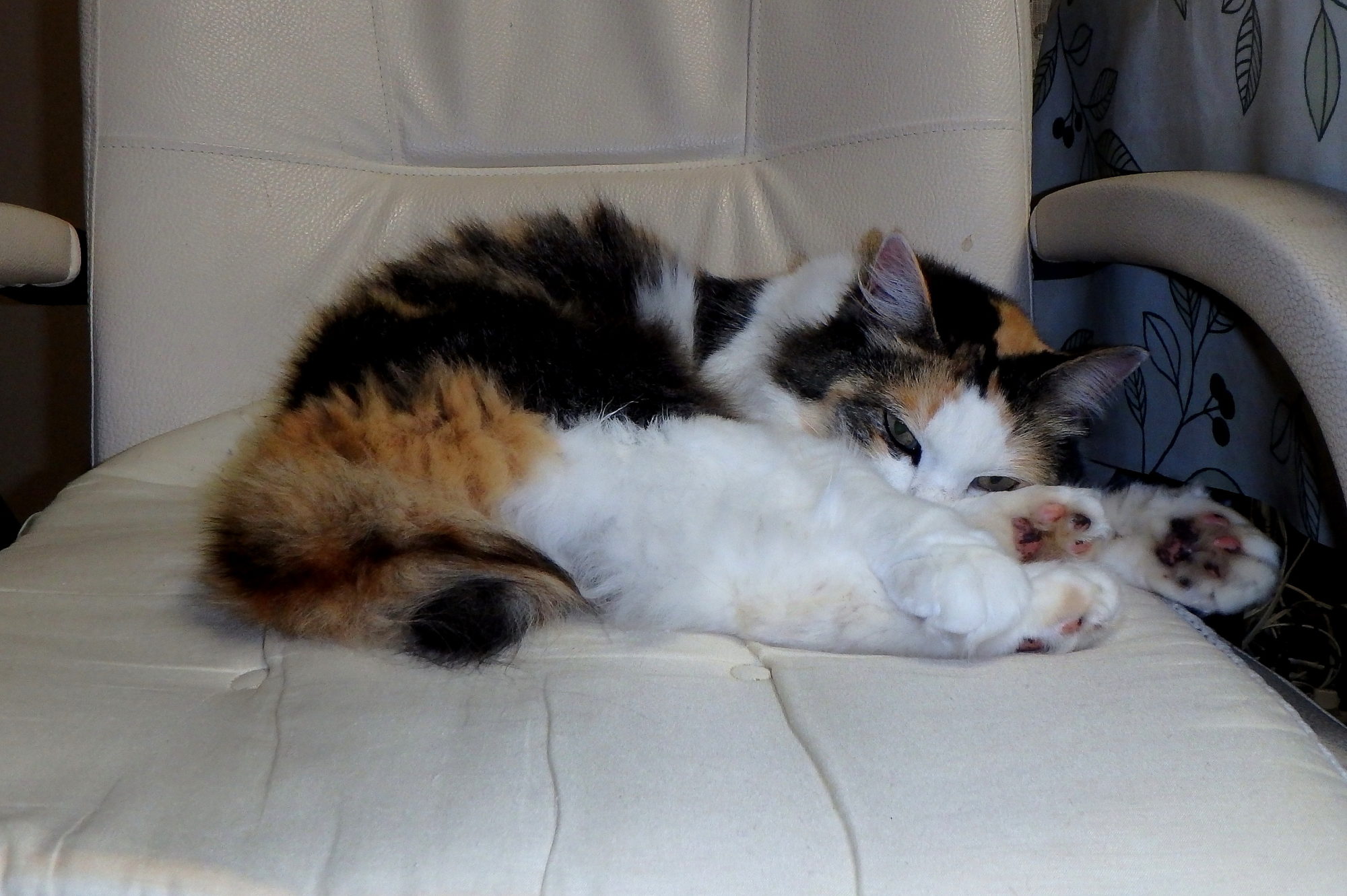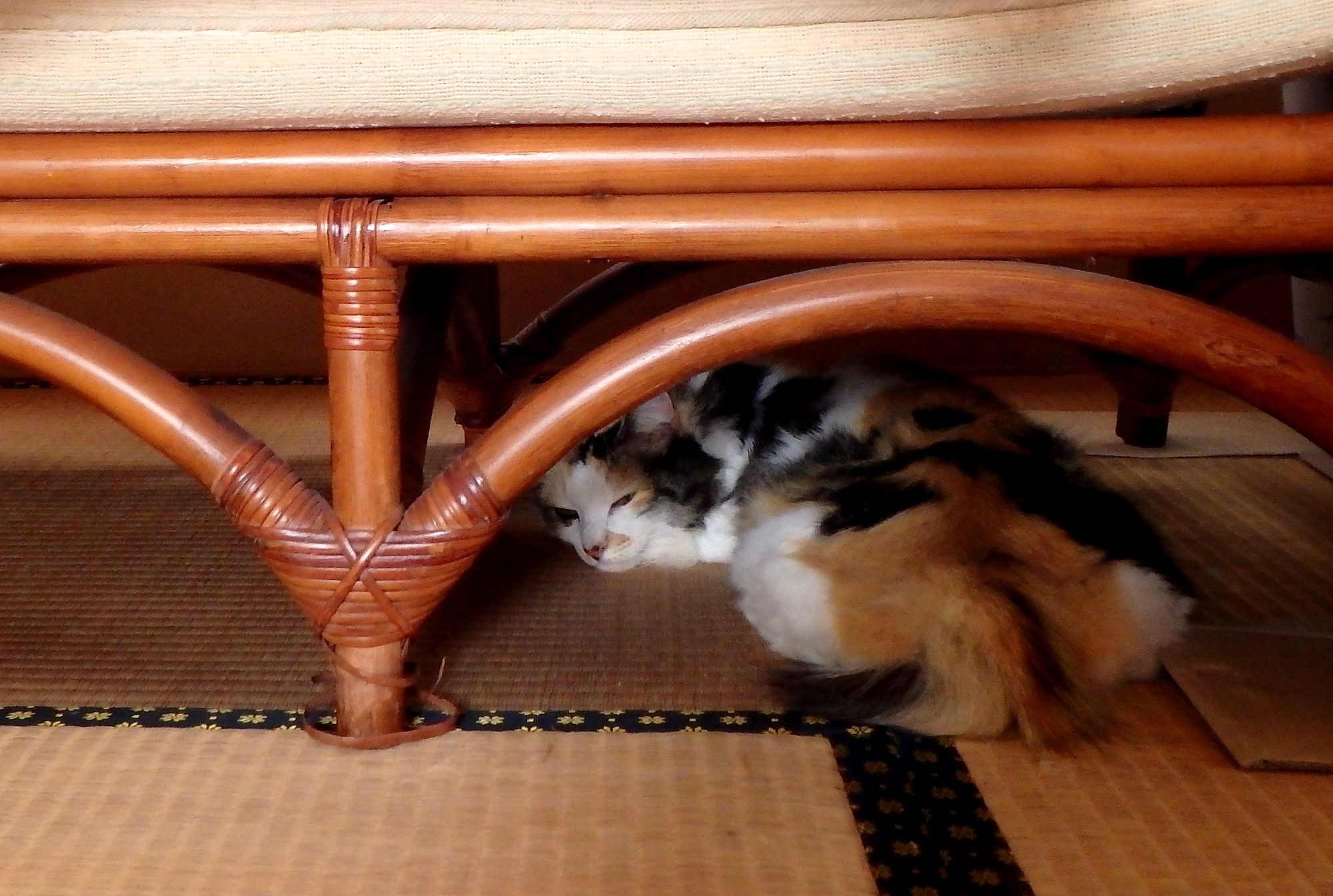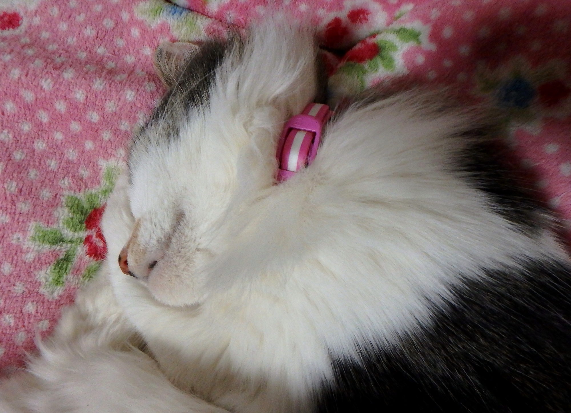 上の猫と別猫のようで、シロは毛深くなってます。実際体重も夏と冬では1キロ以上差がありました。が、自然と夏になると細くなるので、「シロ、どうやってダイエットしたのか?」と太り気味の人間が二人ほど聞いてました。太ると毛繕いも大変そうで、襖や柱に寄りかかって毛繕いしてました。重い時は、6キロ近くありました。