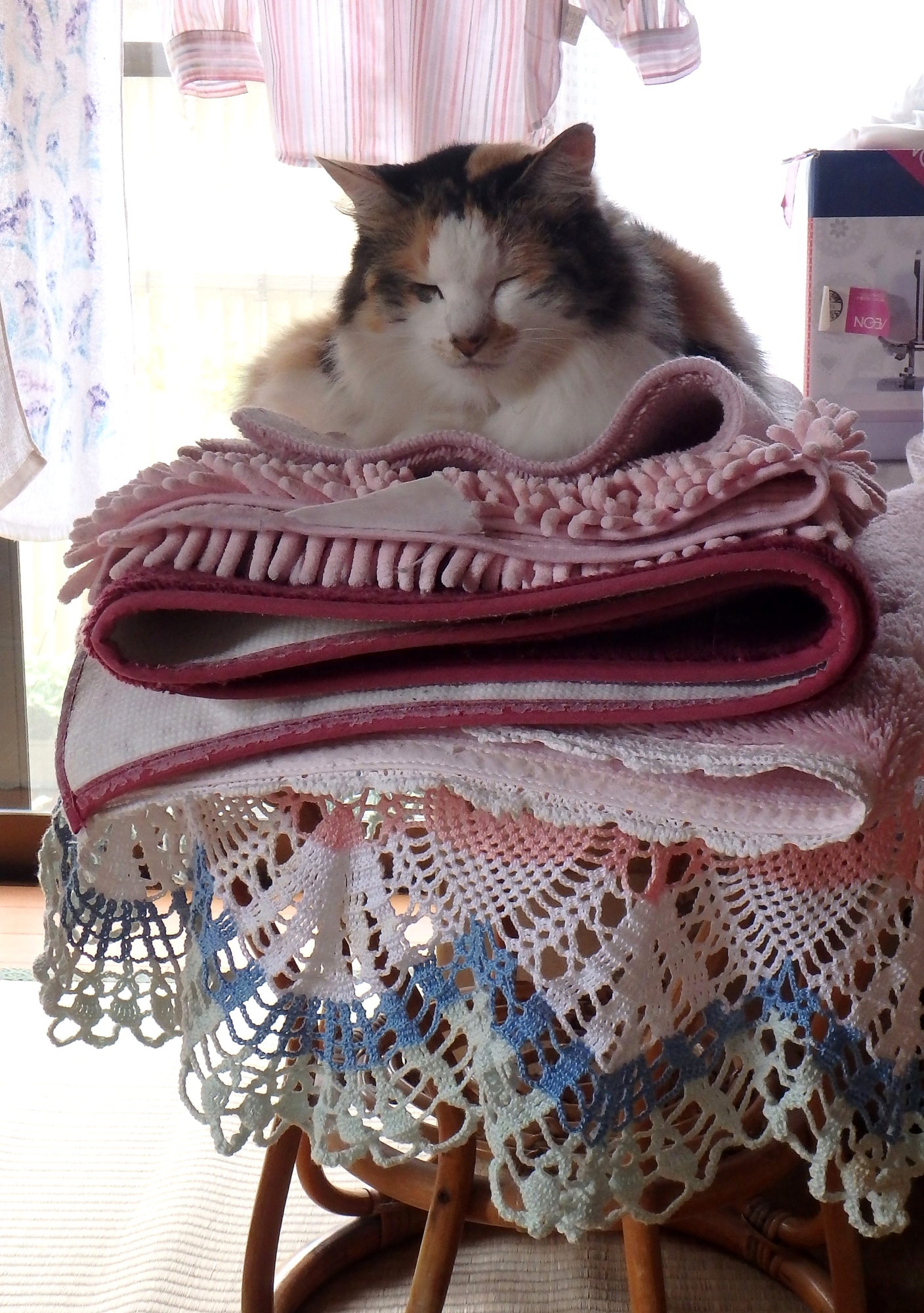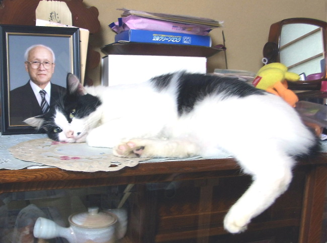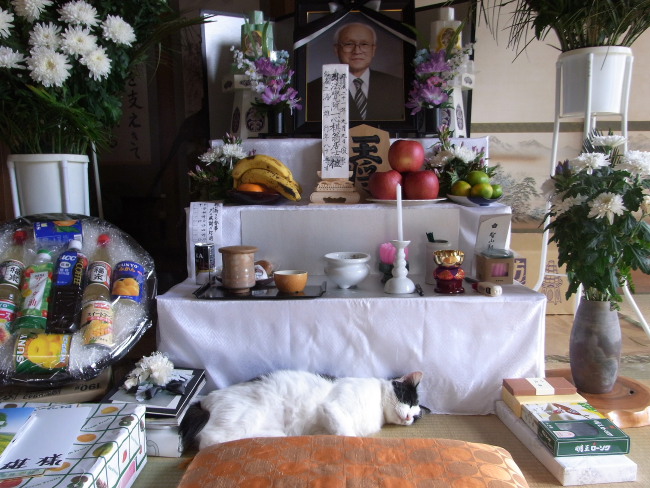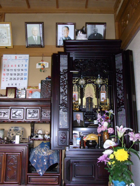 仏壇を入れました。猫は高い所が好きですね。2010年5月頃で、仏壇に上がるとシロは母によく怒られてました。