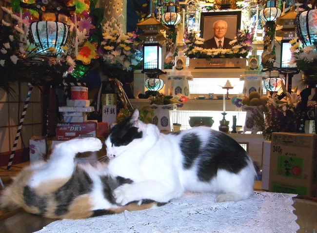 2010年8月15日父の新盆です。その祭壇の前で2匹でじゃれあってます。こんな光景が目の前にあると、流石に父も笑って眺めているのではないかと思われます。シロちゃんの話はひとまず終わります。