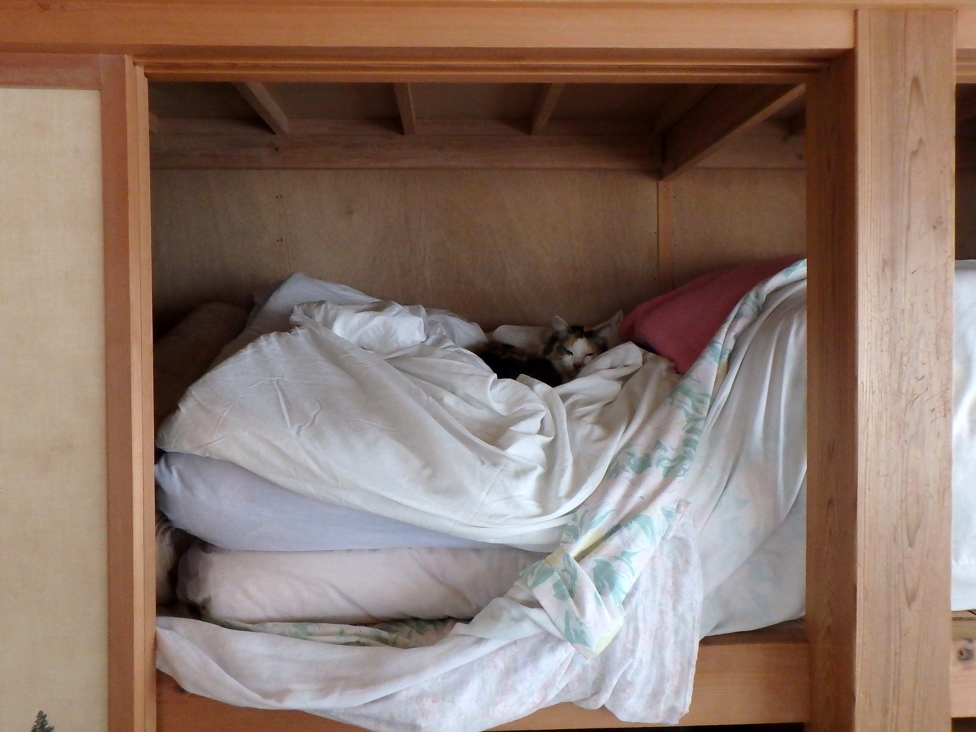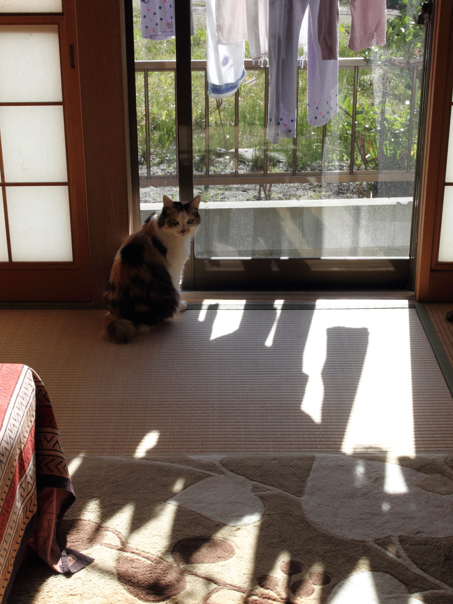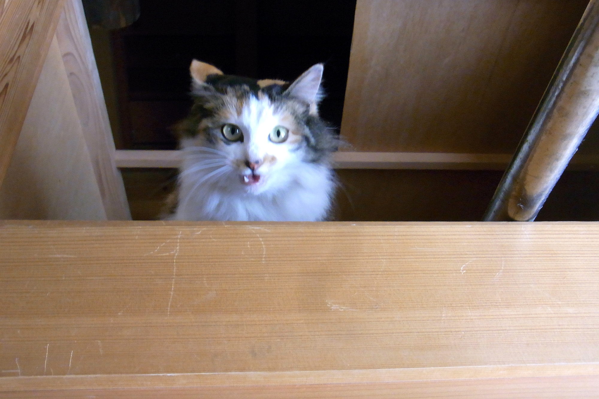 ミーちゃんは、修復してた頃は、2階の押し入れの天袋の中へ逃げ込んでました。猫相も不安げな表情です。もともと人嫌いであったので、ますます人に近寄らなくなりました。外壁も穴が開いていたので、よその猫が餌を嗅ぎ付けて入ってきてました。2011年4月2日のミーちゃんです。