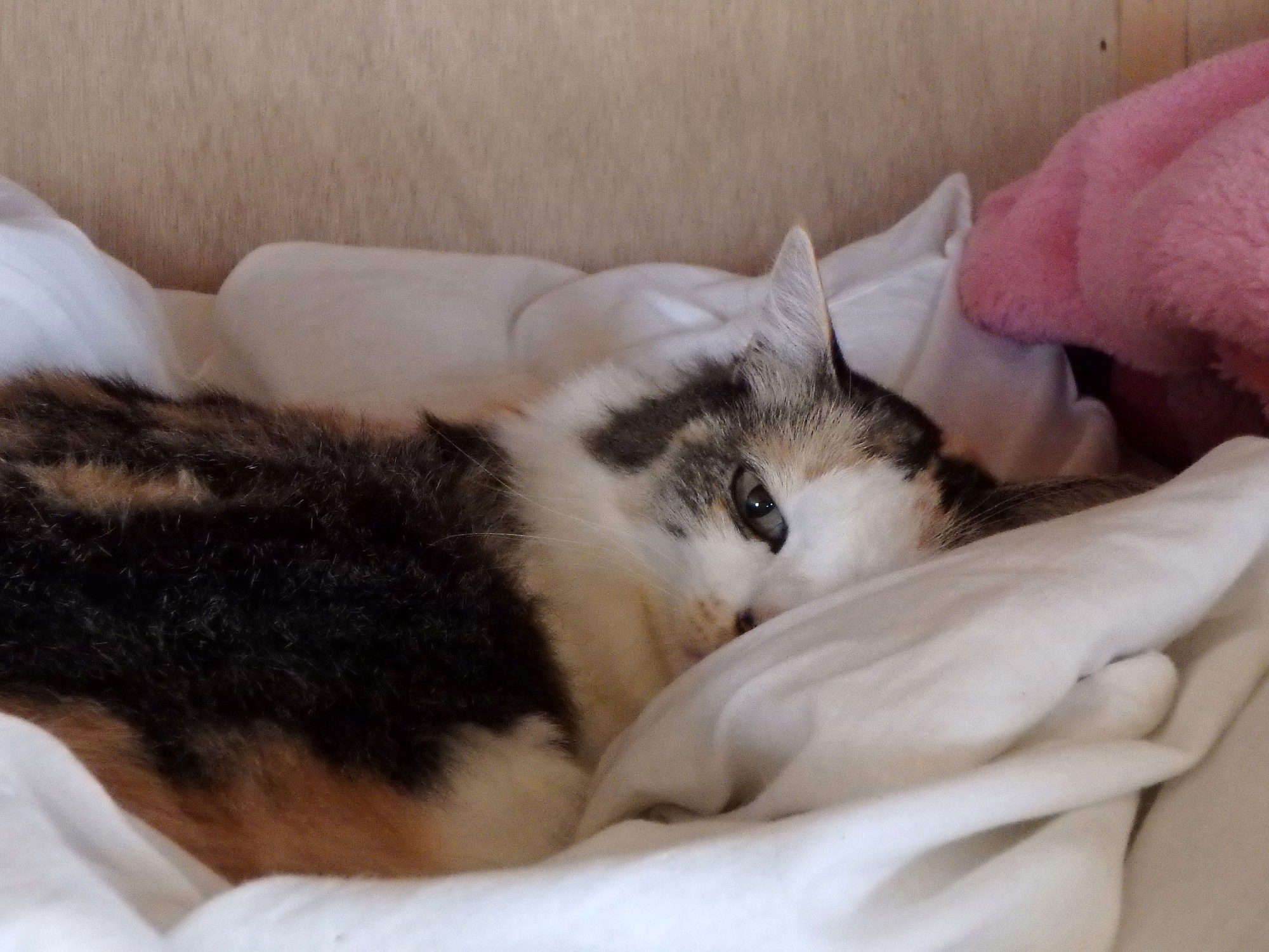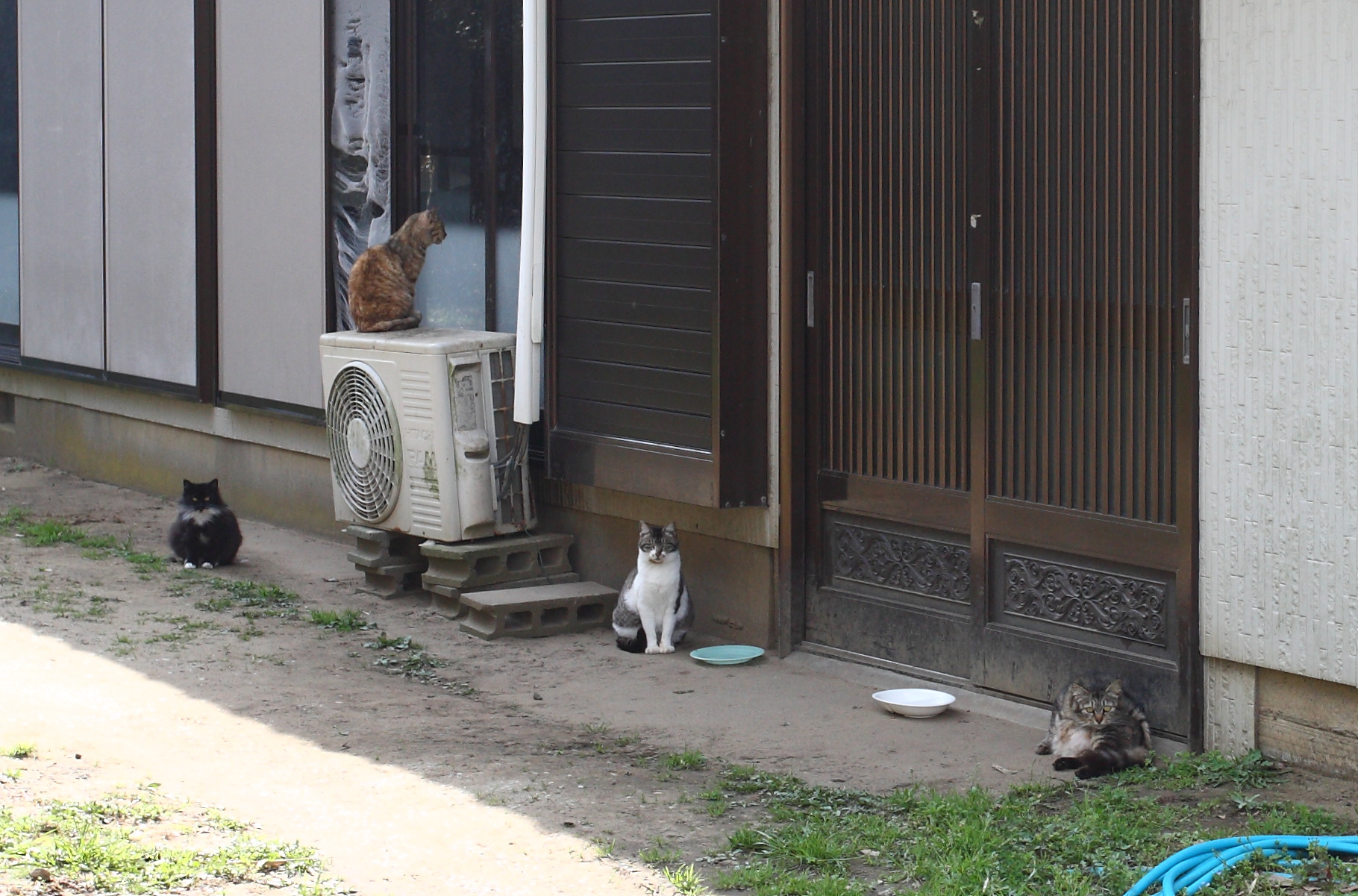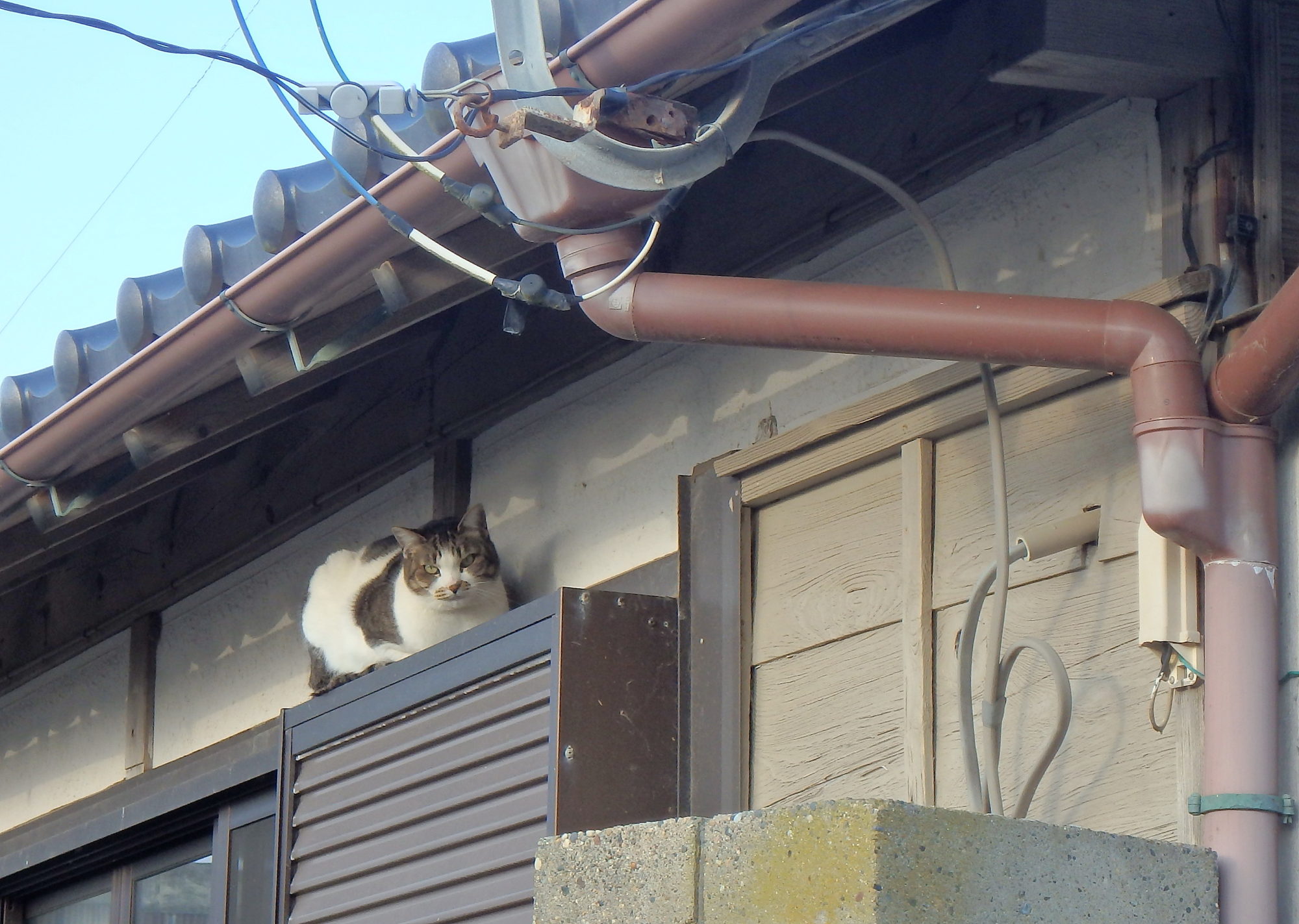 ミーちゃんは、修復してた頃は、2階の押し入れの天袋の中へ逃げ込んでました。猫相も不安げな表情です。もともと人嫌いであったので、ますます人に近寄らなくなりました。外壁も穴が開いていたので、よその猫が餌を嗅ぎ付けて入ってきてました。2011年4月2日のミーちゃんです。