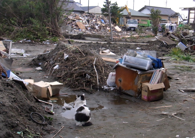 2011年3月23日撮影です。震災後、津波の後の瓦礫を片付けている最中の周囲の様子です。シロは、何を考えているのか?目の前の水溜りの水が飲めるかどうかかもしれないし、いなくなってしまったGFのことかもしれません。