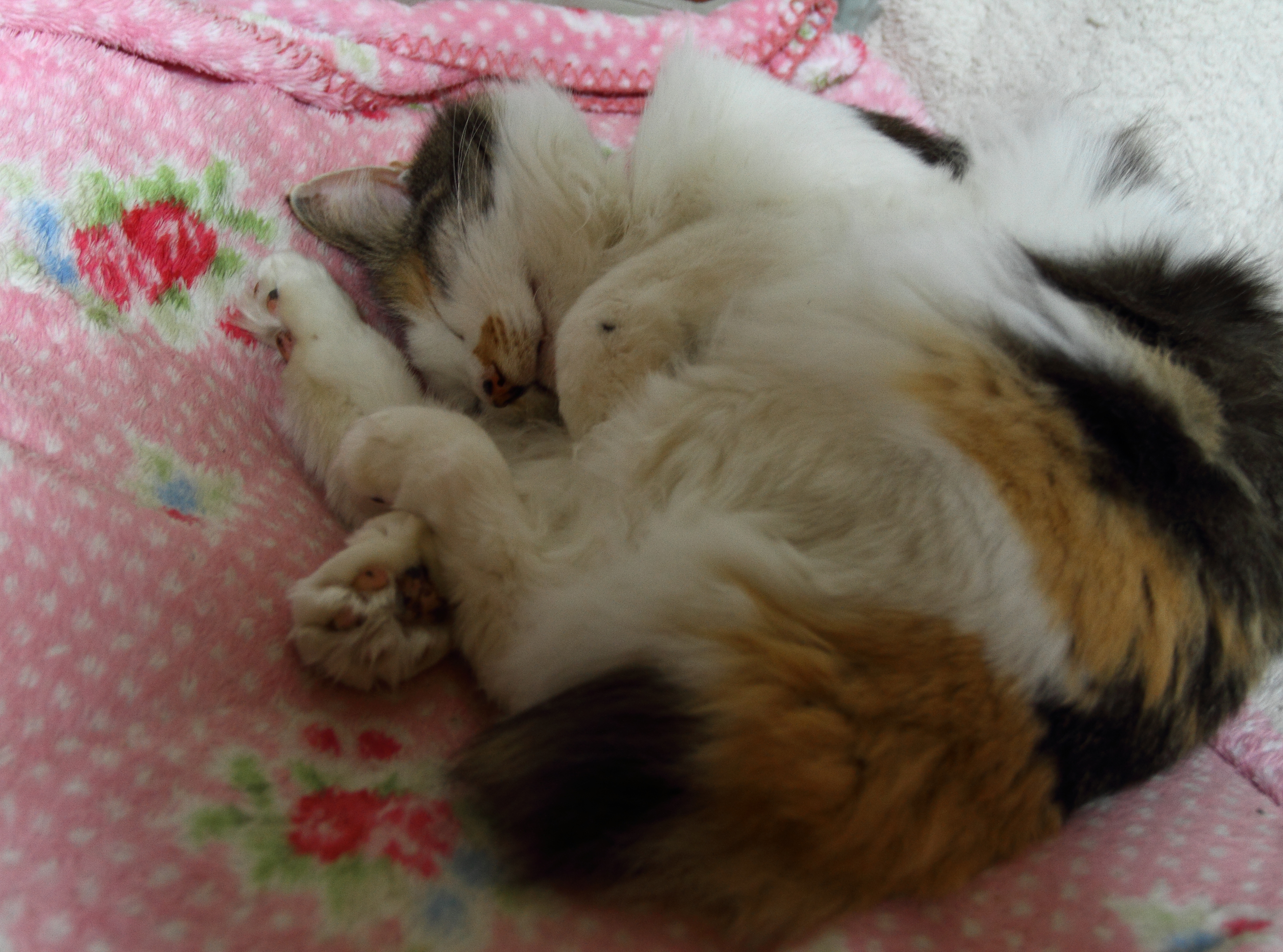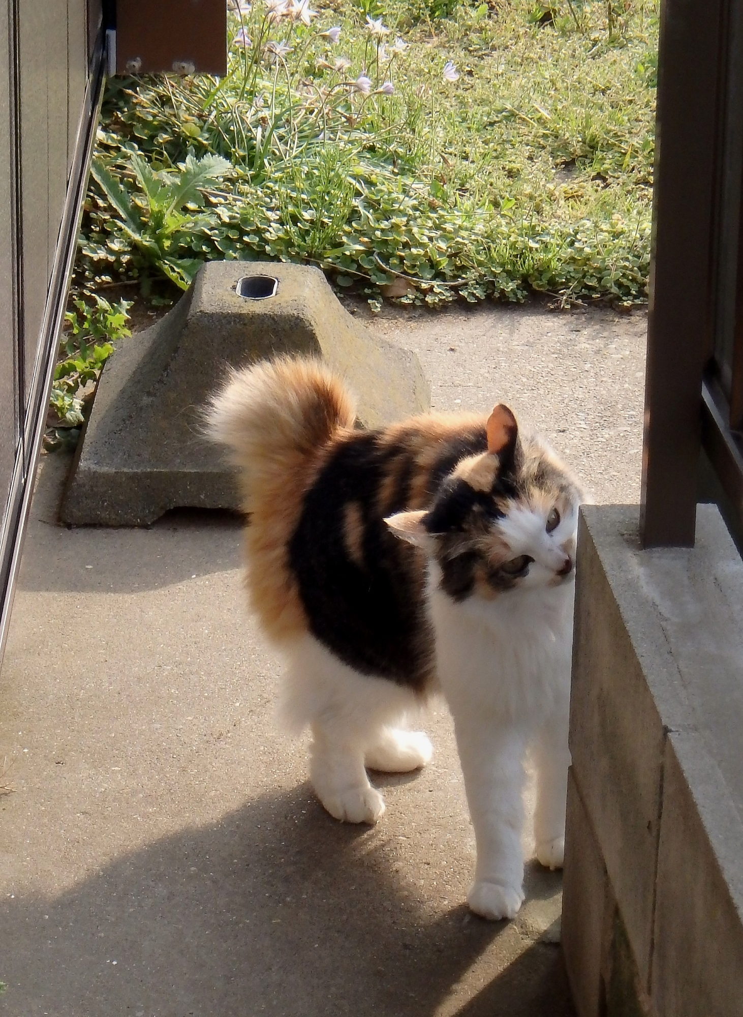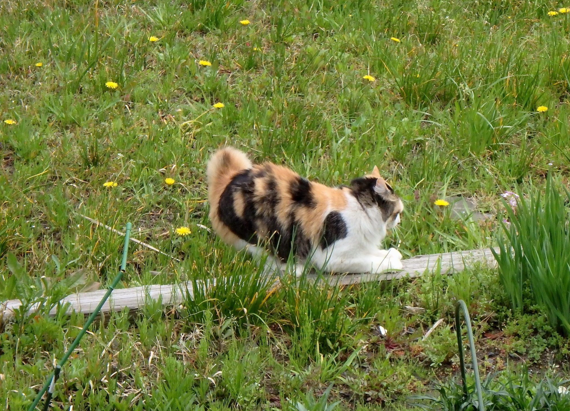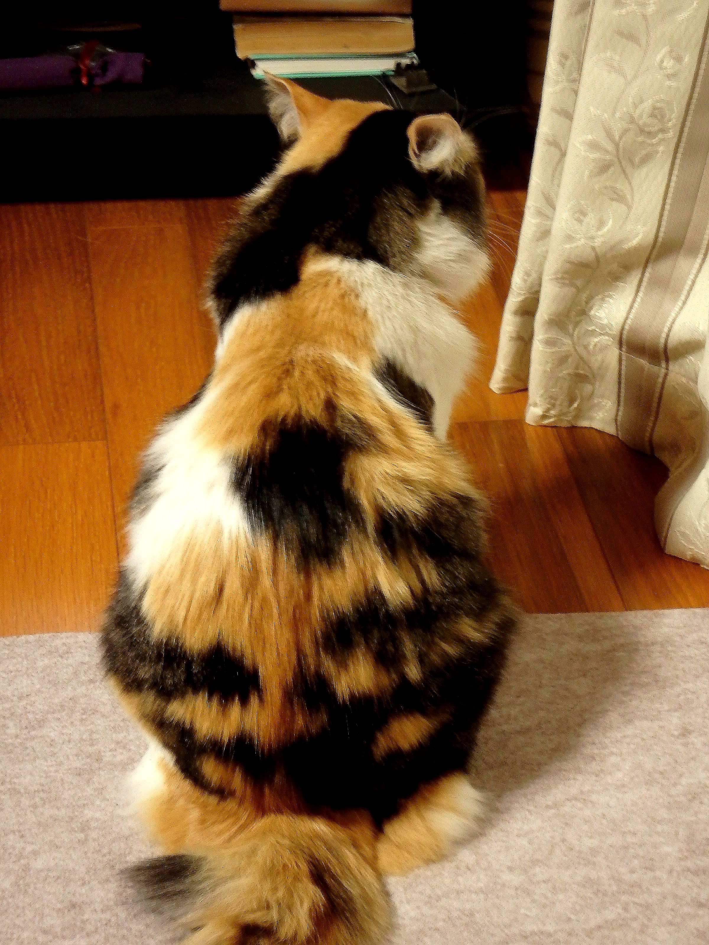 声を掛けると、耳だけ一応こちらを向く。背中の三毛模様です。