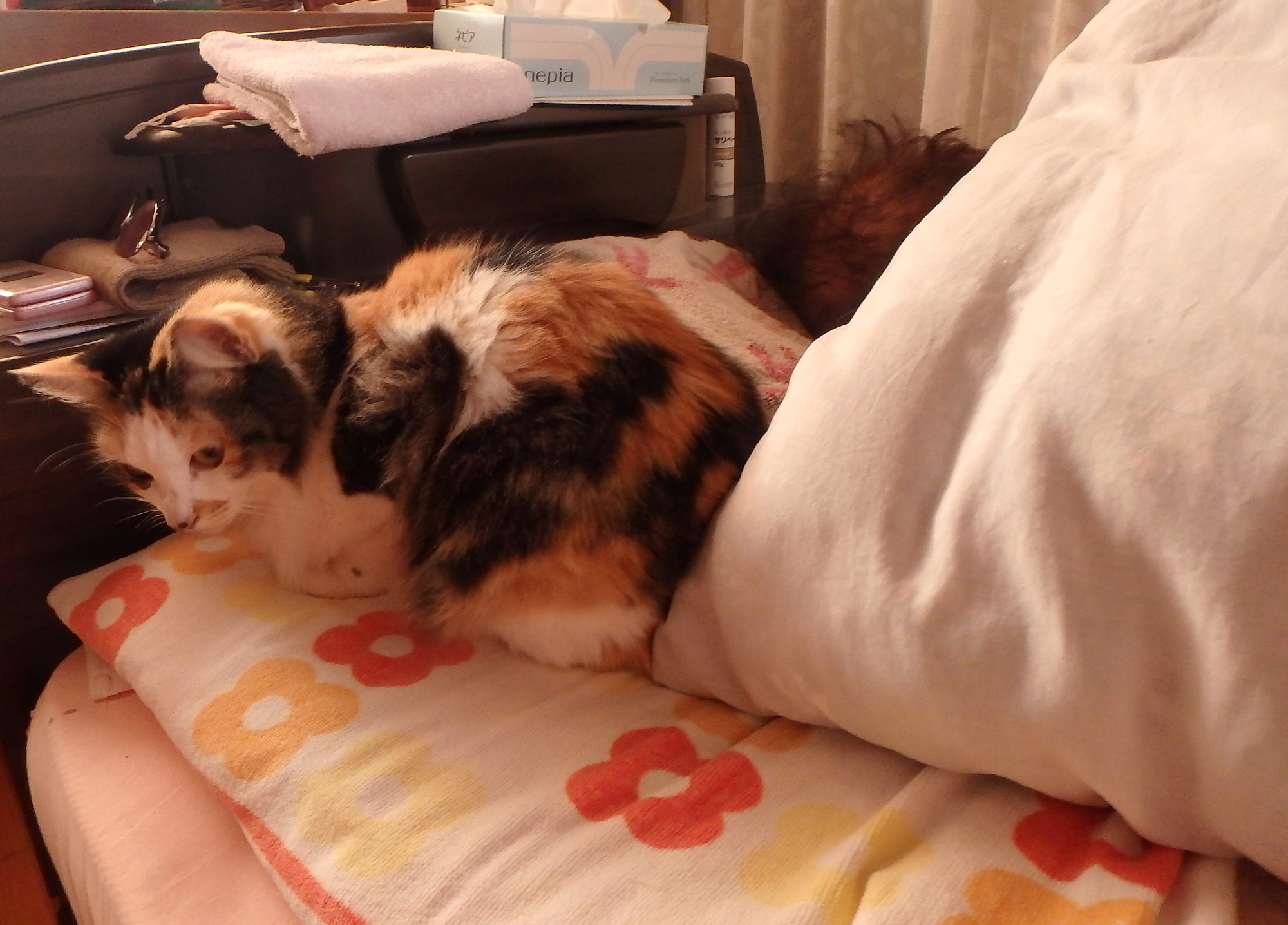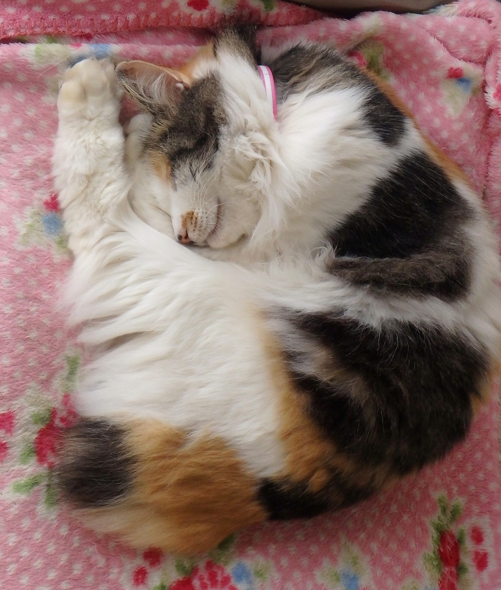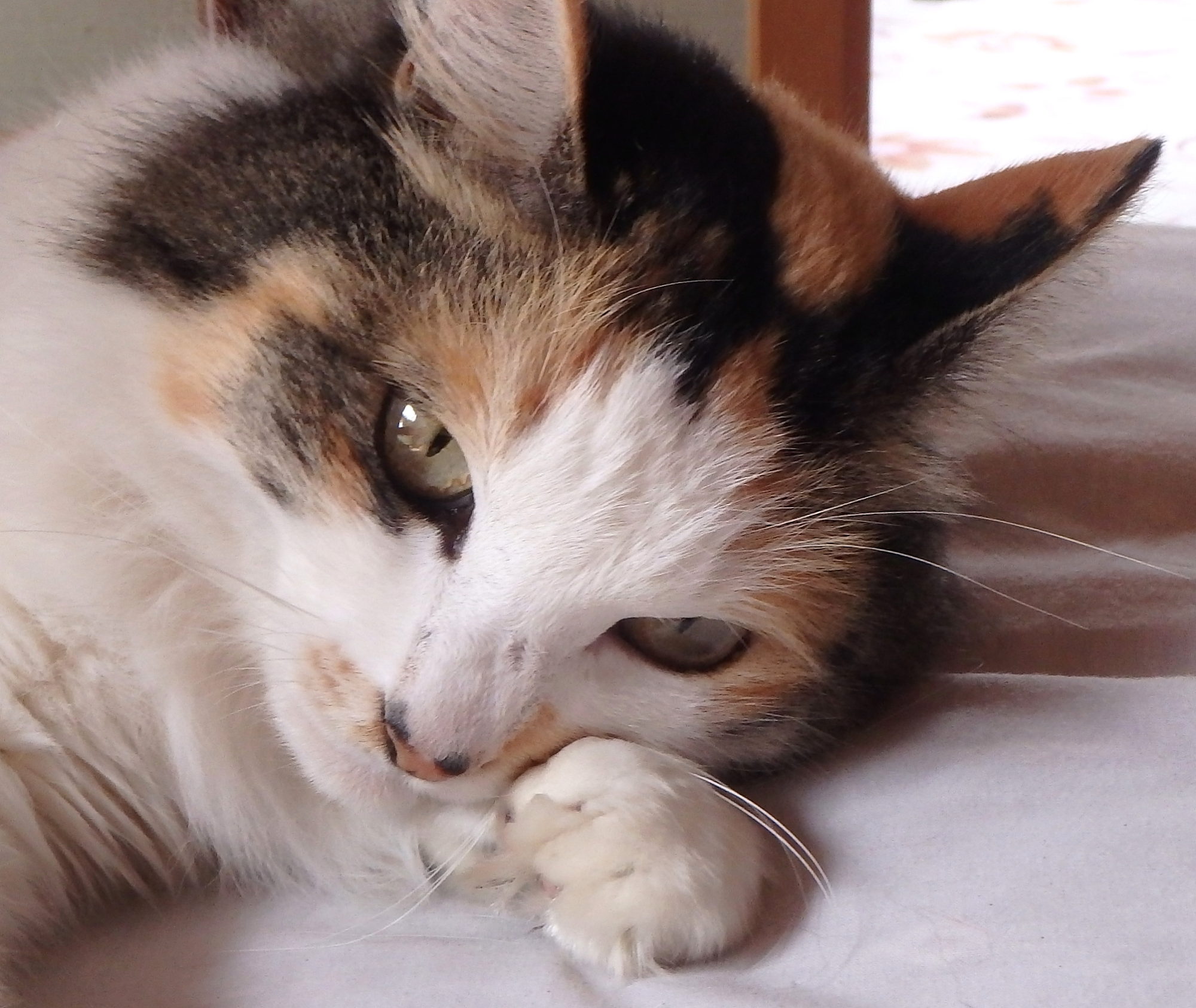 声を掛けると、耳だけ一応こちらを向く。背中の三毛模様です。
