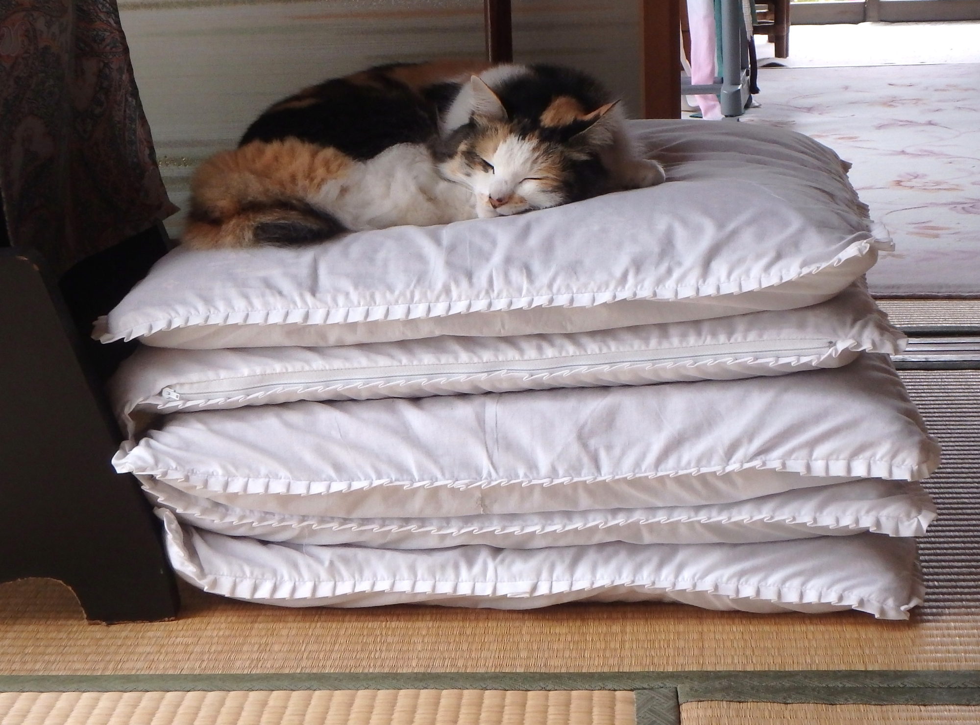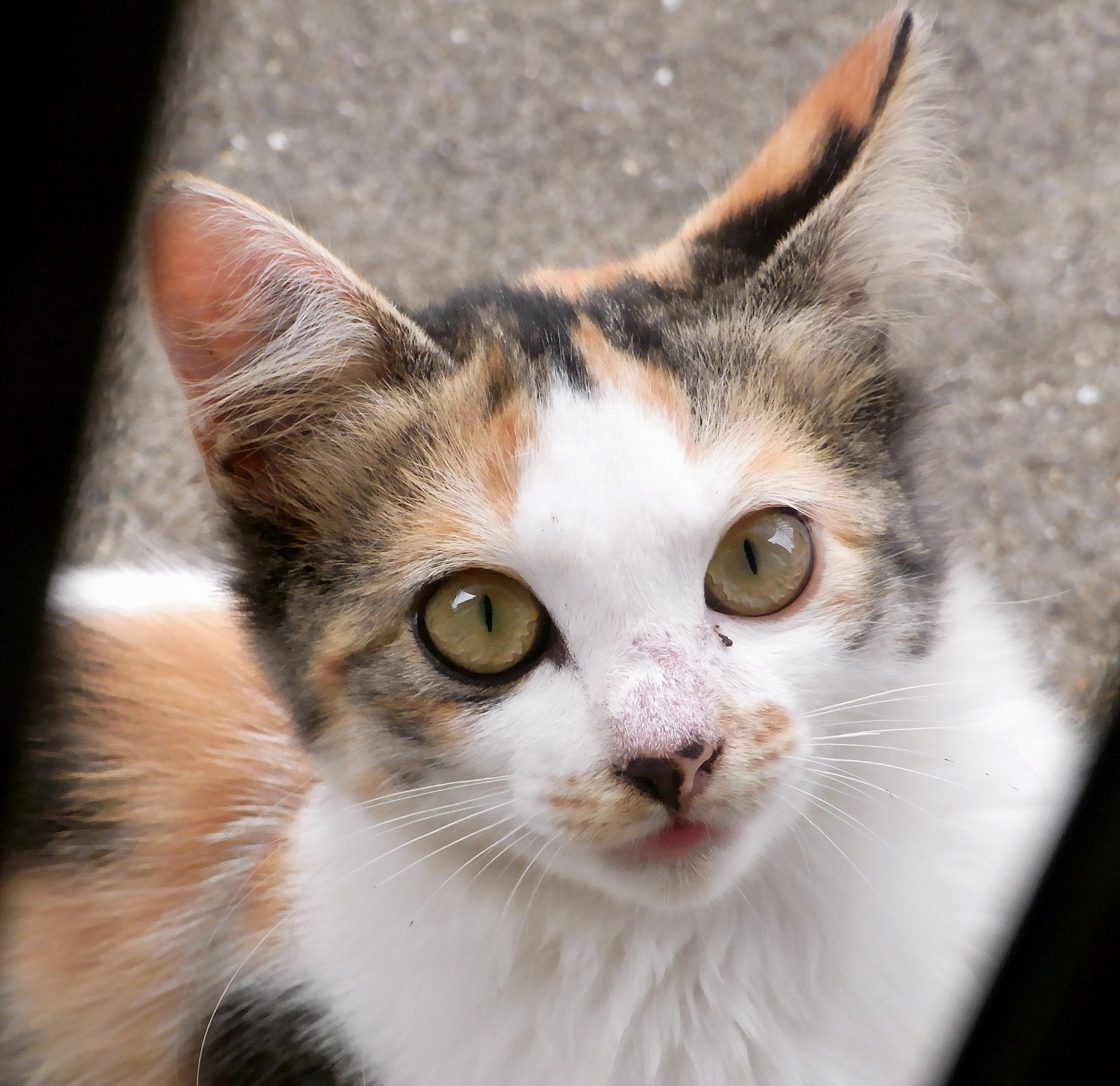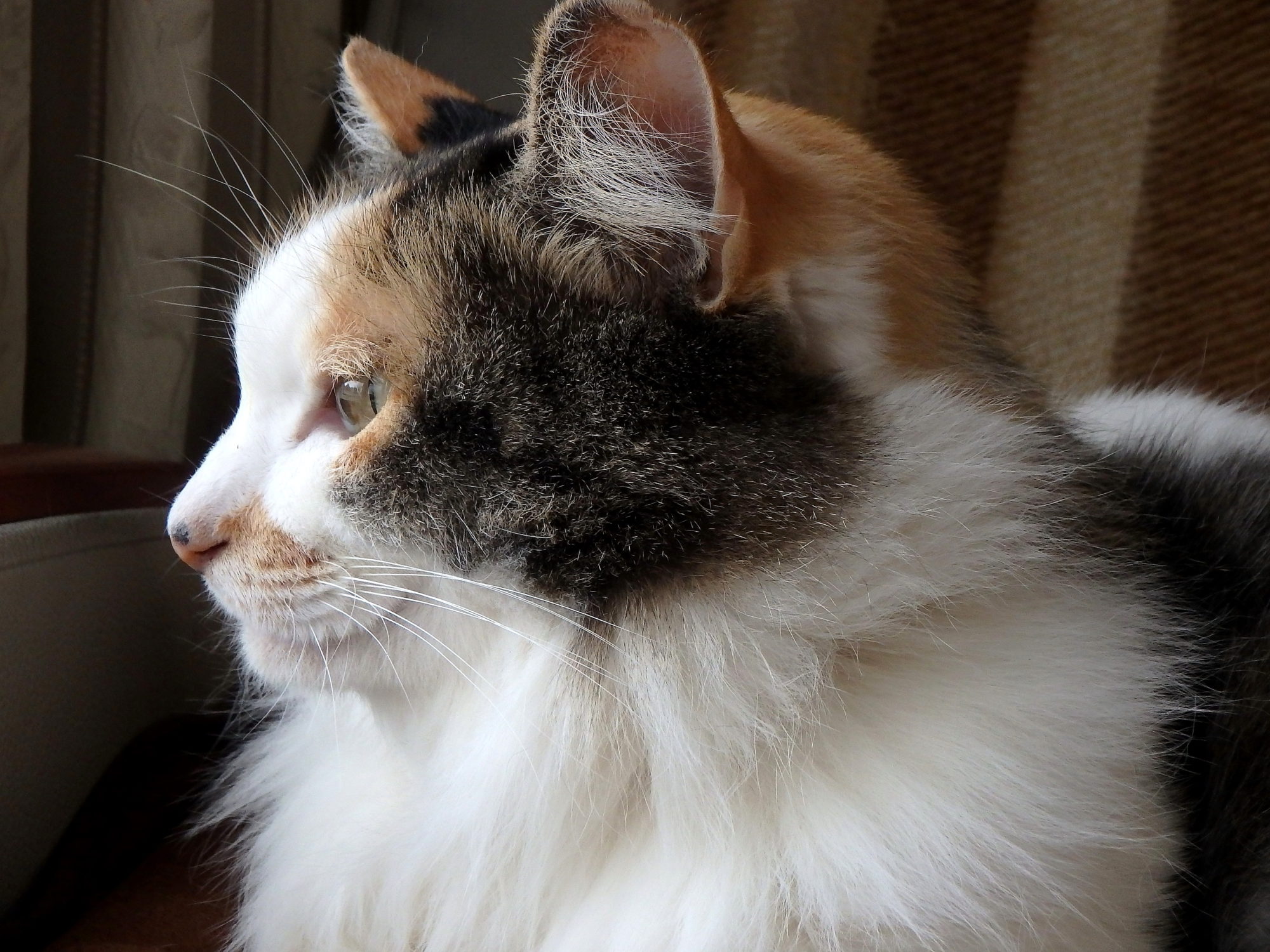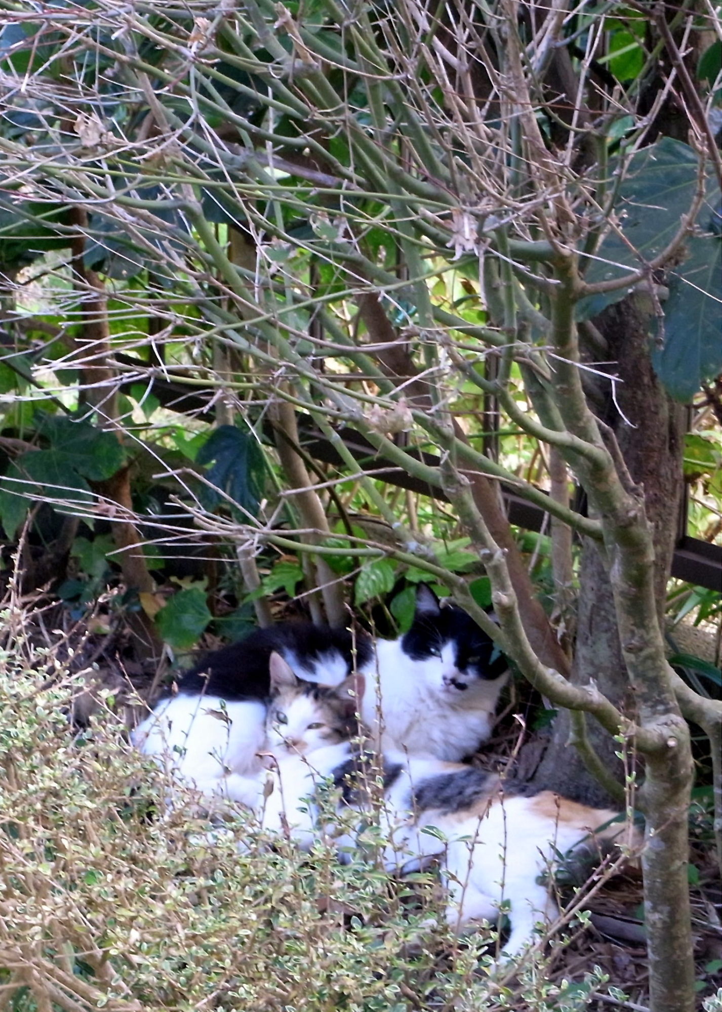 声を掛けると、耳だけ一応こちらを向く。背中の三毛模様です。